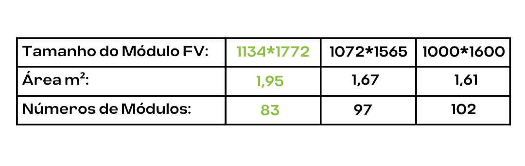 A parte da “Copa”, podem acomodar o seguinte número de painéis fotovoltaicos dependendo do tamanho escolhido: