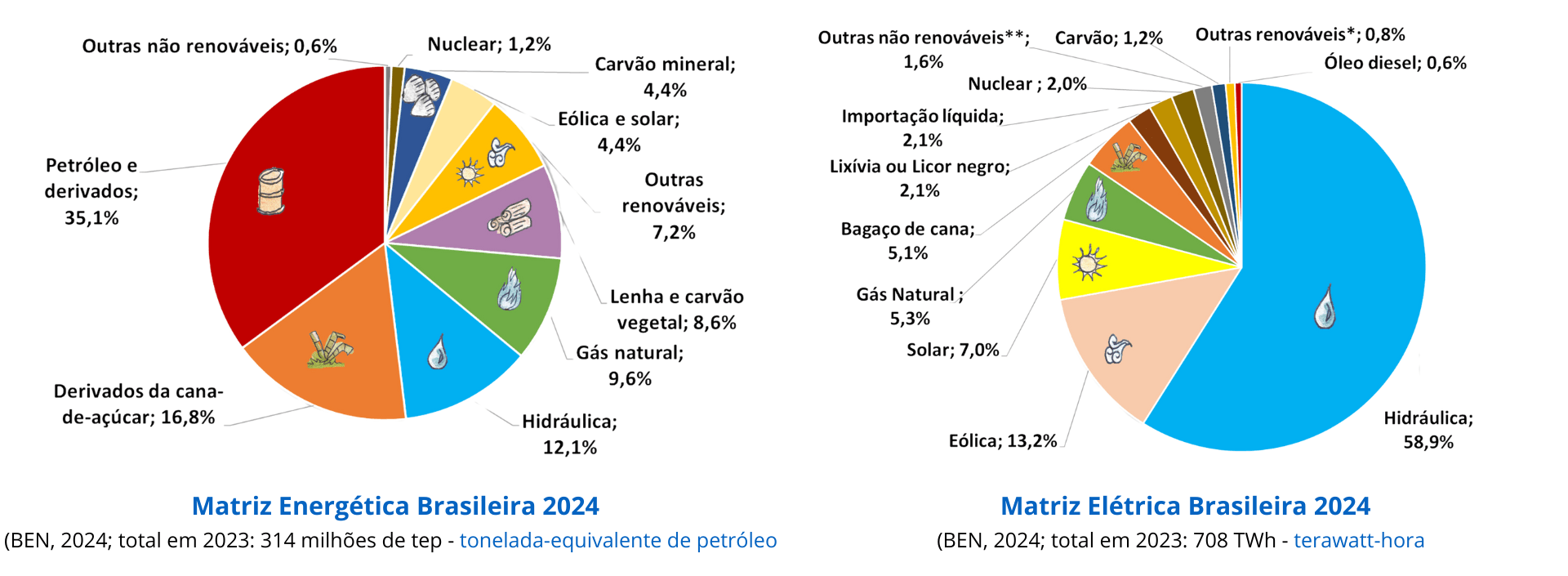 Essas diferenças evidenciam a importância de expandir o uso de fontes renováveis tanto na matriz elétrica quanto na energética, fortalecendo a transição para um modelo mais sustentável. A matriz energética brasileira ainda conta com um grande número recursos não renováveis como petróleo e derivados, por conta, principalmente de transporte, aquecimento, fogão, geradores, etc.