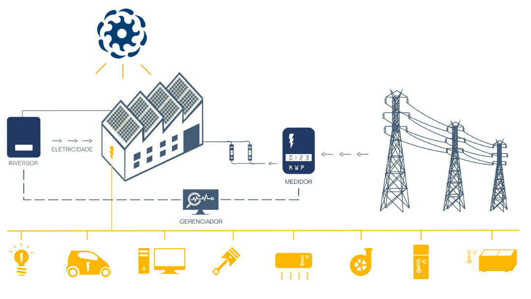 Durante o dia, a geração é constante e consumida simultaneamente, a energia gerada que não for consumida é injetada na rede elétrica, criando os "Créditos de energia". A noite ou em dias com pouca incidência solar, o sistema fotovoltaico não gera a quantidade necessária para consumo, neste caso, o consumo de energia será pela rede elétrica.