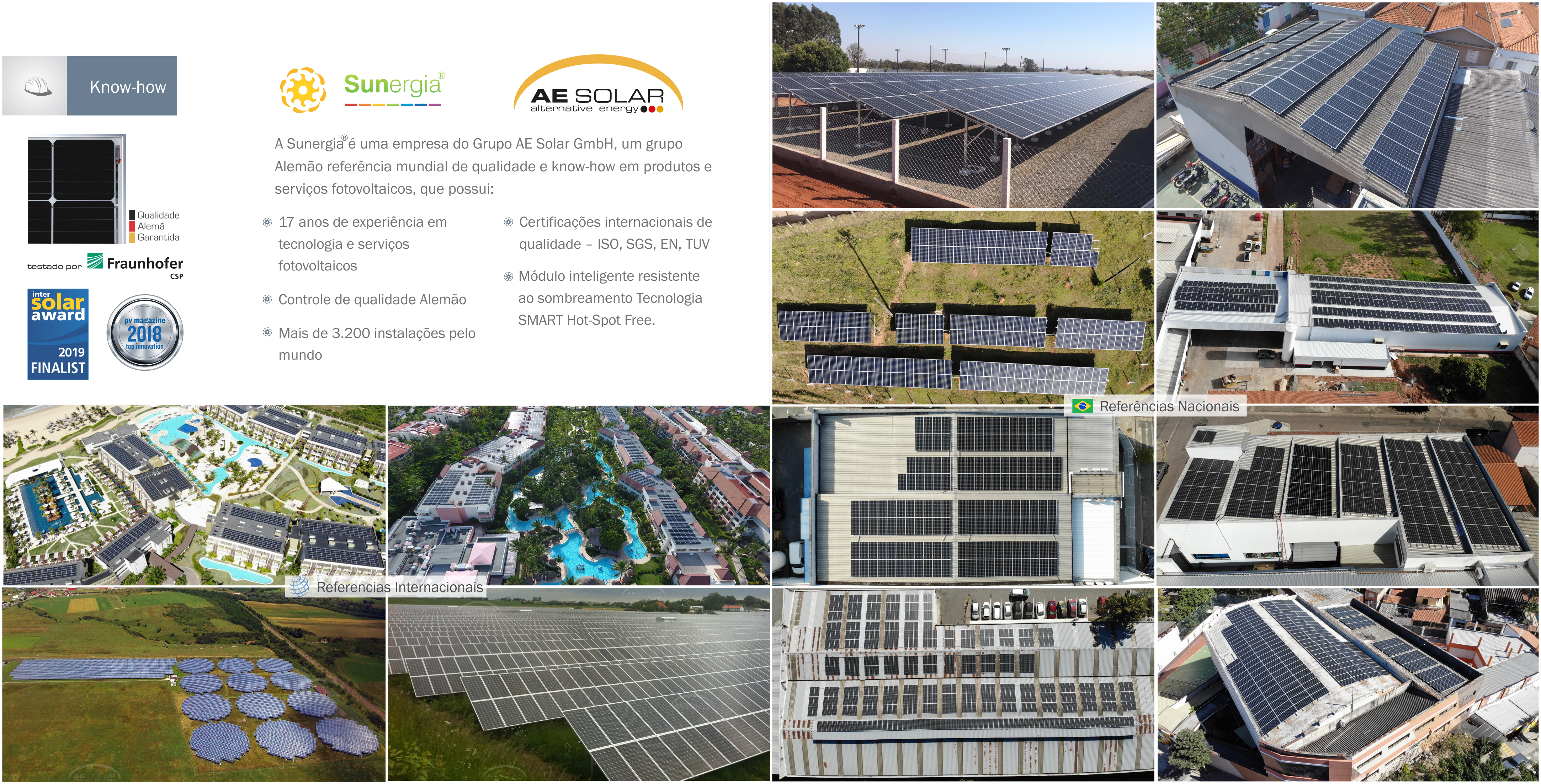 A Sunergia® é uma empresa do Grupo AE Solar GmbH, um grupo Alemão referência mundial de qualidade e know-how em produtos e serviços fotovoltaicos, que possui: ☀ Mais de 16 anos de experiência em tecnologia e serviços fotovoltaicos ☀ Controle de qualidade Alemão ☀ Mais de 3.200 instalações pelo mundo