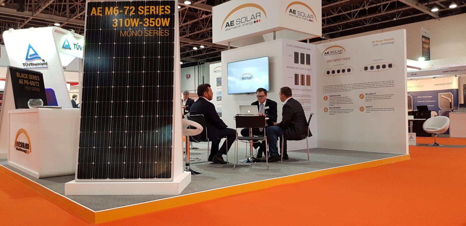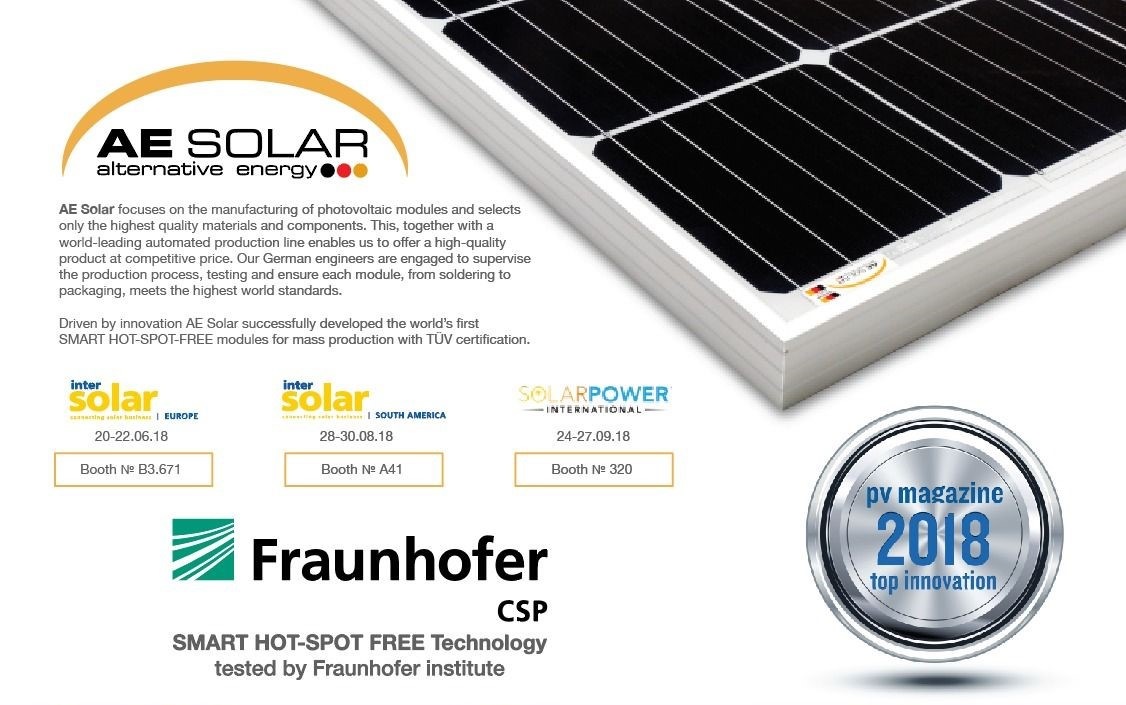 Módulos fotovoltaicos da AE Solar operem com segurança e suavemente por pelo menos 30 anos com a garantia do produto de 12 anos. 100% de taxa de teste para inspeção visual, testes de EL, testes de pressão, testes de carga mecânica e testes de idade.Nossos módulos resistentes a AE Smart Hot-Spot Free Shading foram premiados com a PV Magazine na categoria “Top innovation 2018”.O júri da revista homenageou pelo desenvolvimento da resistência ao sombreamento, no qual cada célula é protegida por seu próprio diodo de desvio.