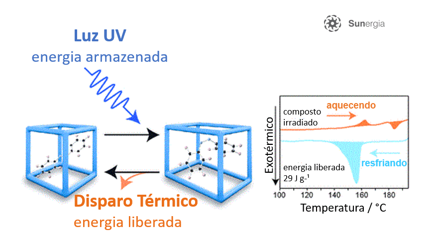 A energia é liberada novamente com a aplicação de calor, que funciona como um gatilho para mudar o estado do azobenzeno, e essa liberação pode ser muito rápida, como uma mola comprimida que volta ao seu estado não tensionado. Isso fornece um aumento de calor que pode ser usado, por exemplo, para aquecer água, cujo vapor pode então ser usado para gerar energia.