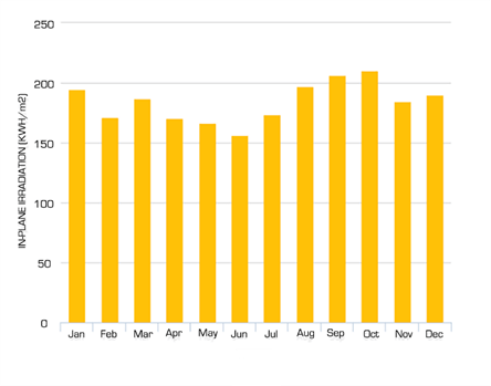Situados principalmente no cinturão solar, os países latino-americanos possuem grande potencial para aplicações de energia solar. O Brasil possui um dos maiores índices de insolação do mundo. No Brasil, a radiação global tilt varia de até 8 kWh / m² / dia. A radiação de inclinação é a radiação total recebida na superfície do painel solar com uma inclinação definida. A Figura 2 mostra a irradiação inclinada global média mensal em um ângulo de inclinação fixo com latitude e longitude fixas.