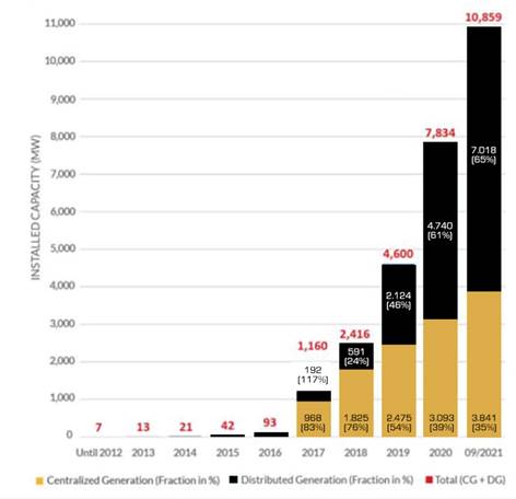 De acordo com a Associação Brasileira de Energia Solar Fotovoltaica ( ABSOLAR ), desde 2012 10 bilhões de USD / 8,5 bilhões de euros foram investidos em energia solar e isso criou cerca de 300.000 empregos locais. A figura abaixo indica a evolução da energia solar fotovoltaica no Brasil. Durante os últimos dois anos, a figura mostra que o número de sistemas de geração distribuída cresceu significativamente.