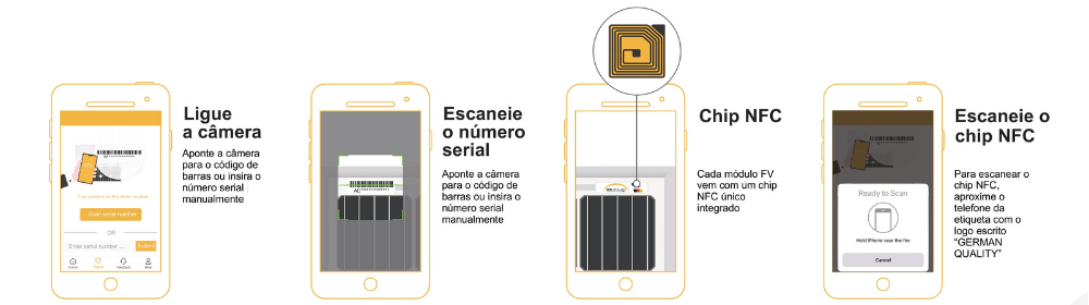 A verificação de autenticidade dos painéis AE Solar é feita por meio do escaneamento do código de barra no aplicativo da fabricante, que também fornece informações sobre o número de série e as especificações técnicas do módulo.