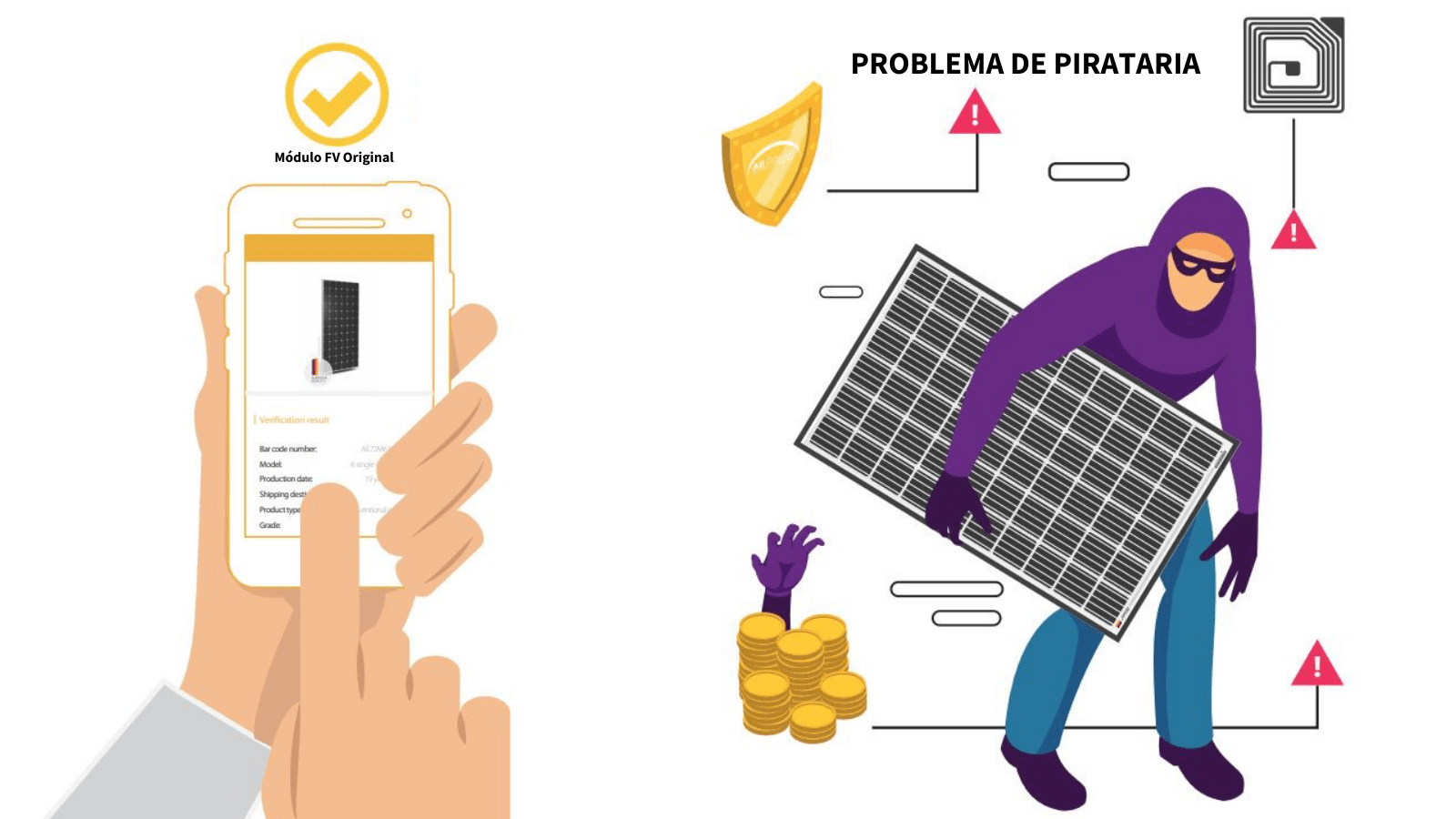 Existem e sempre existiram problemas de pirataria na indústria solar. Na maioria dos casos, as empresas já conhecidas, consolidadas e confiáveis no mercado são afetadas por esse problema. Os empreendedores desonestos estão atentos a essas empresas conhecidas e desenvolvem módulos fotovoltaicos falsos de baixa qualidade, com vida útil curta e alta degradação sob nomes de marcas confiáveis. Infelizmente, o mercado internacional está cheio desses imitadores.